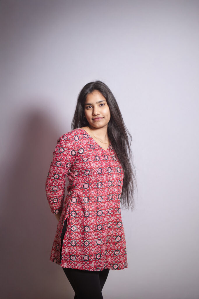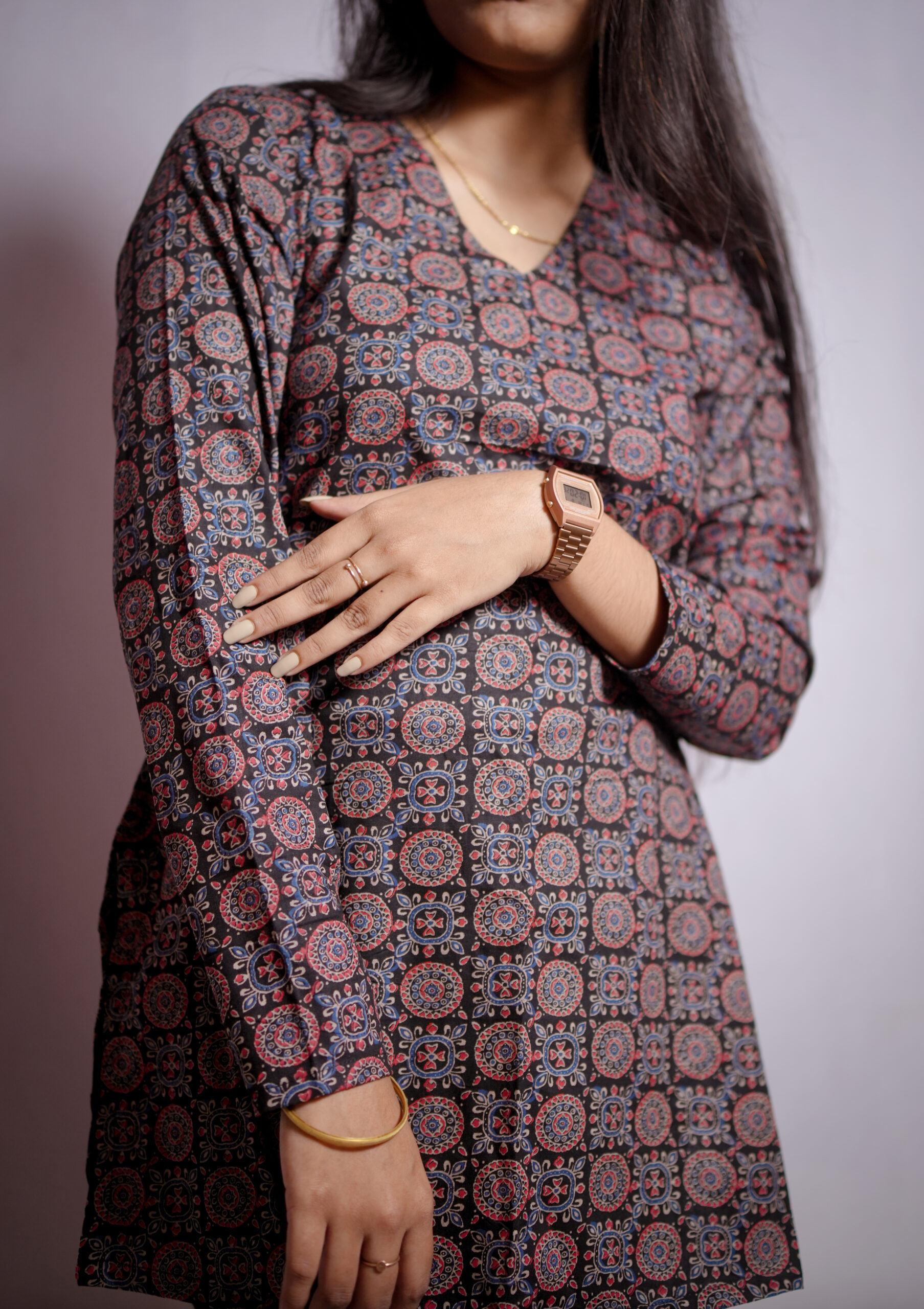 A classic deep blue short kurti featuring intricate, traditional Ajrakh patterns and a sophisticated V-neckline. Crafted from authentic Ajrakh printed fabric for effortless daily wear, this hip-length piece offers a comfortable straight fit and full sleeves, making it a perfect pairing for jeans