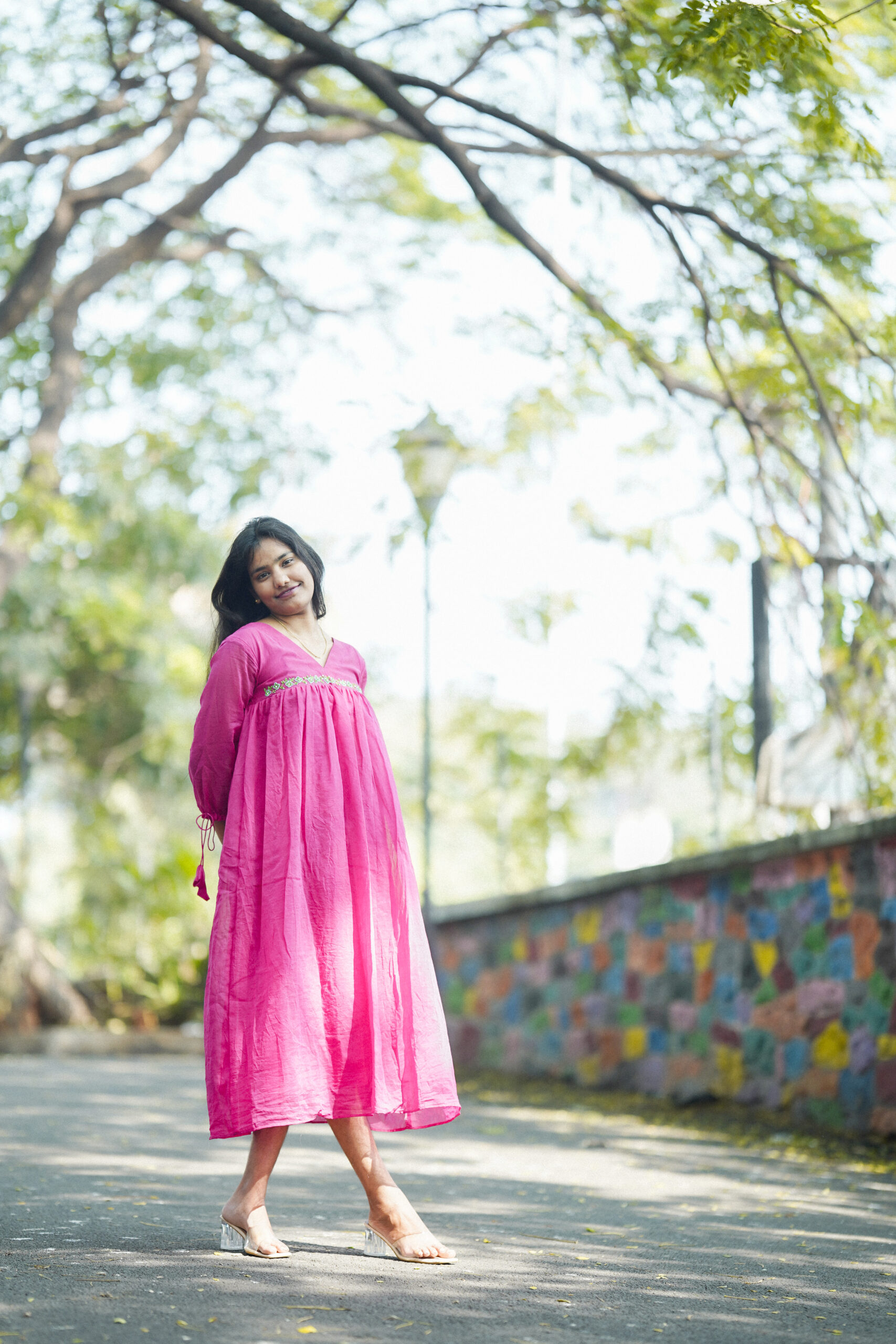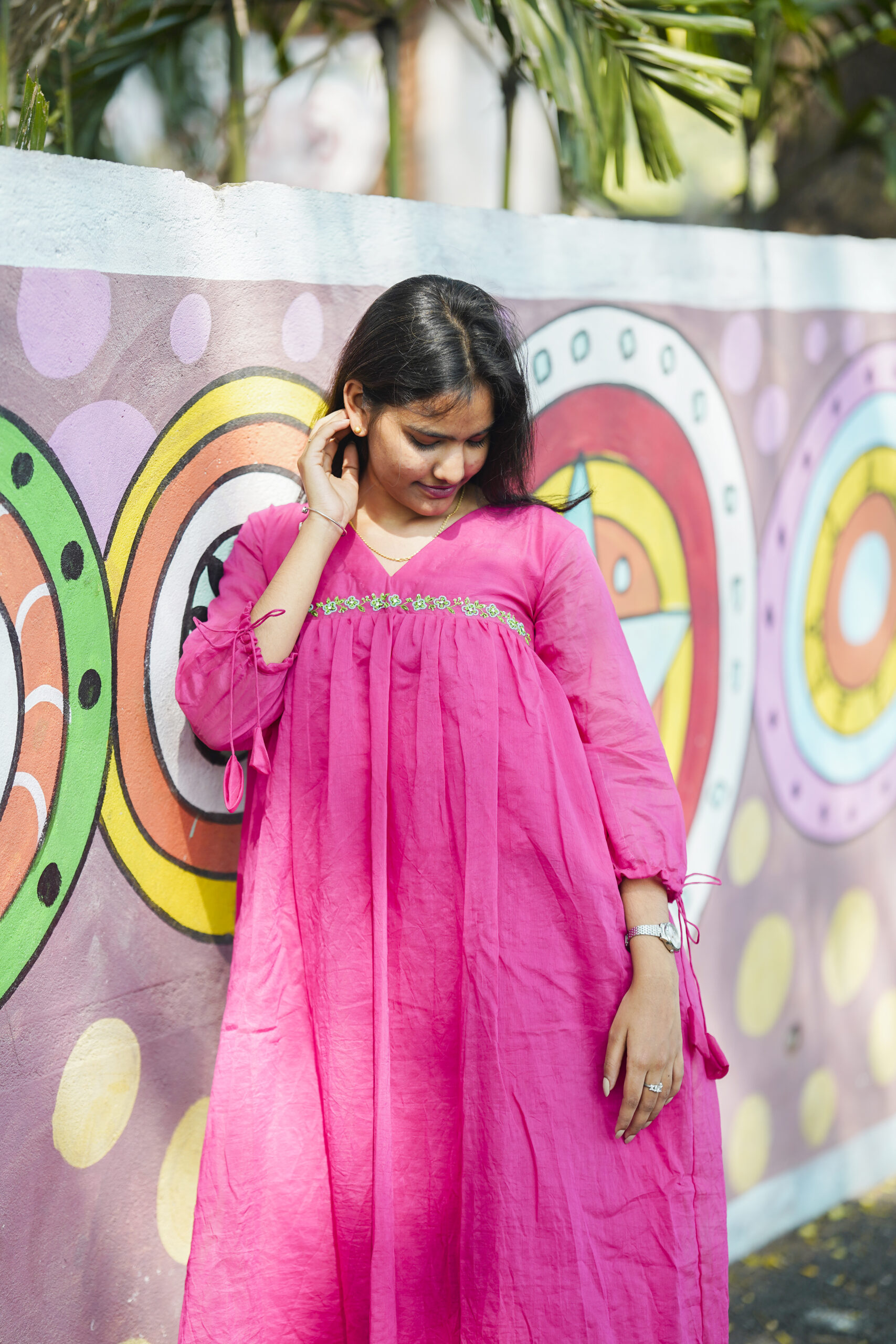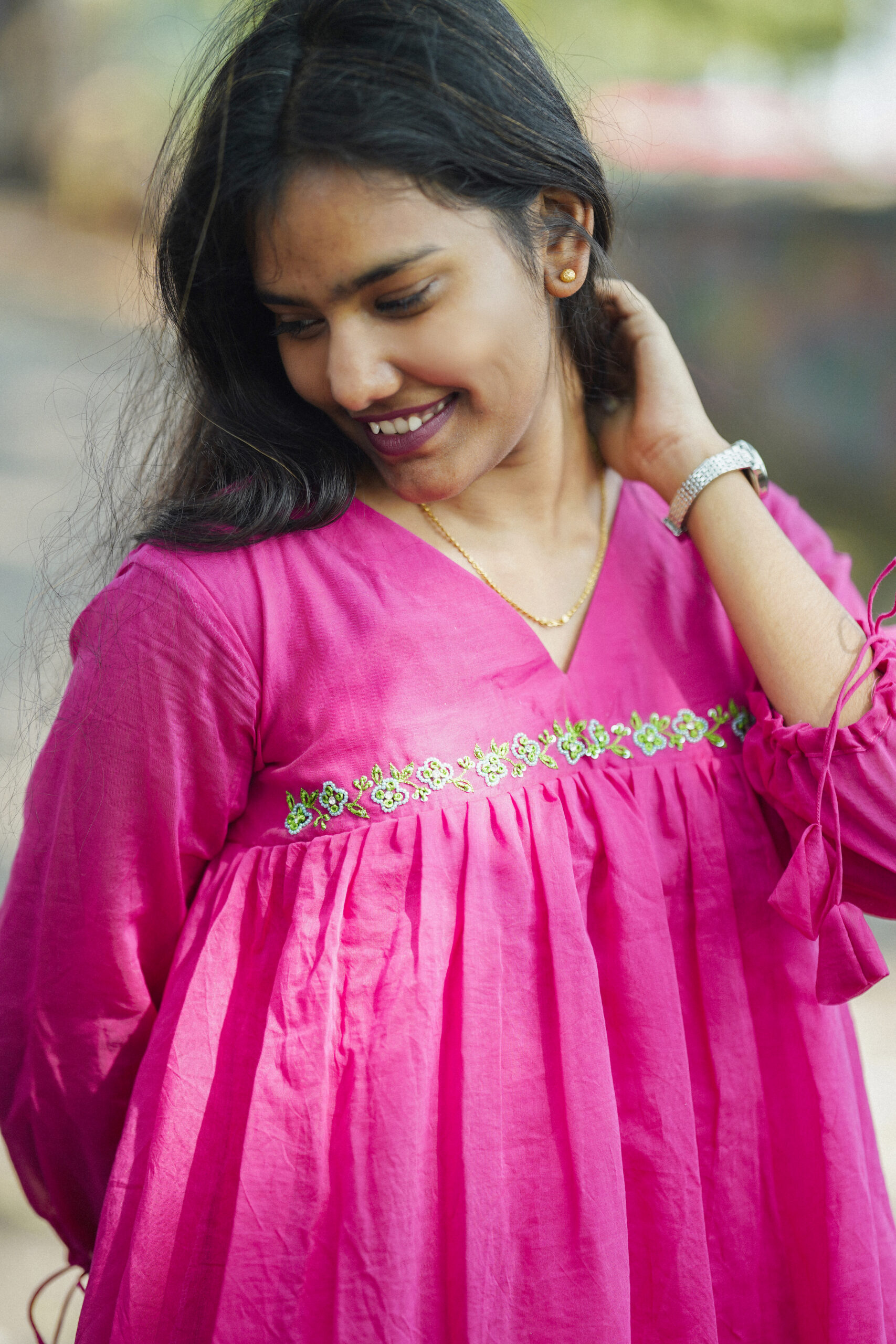 A vibrant pink flowy dress designed for effortless everyday elegance. Featuring a soft V-neckline with delicate detailing and a relaxed silhouette, this breezy piece is perfect for casual outings, daytime festivities, and comfort-led style.